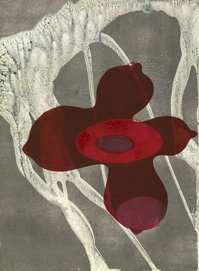I have developed a vocabulary of shapes from observing natural forms. These shapes are repeated and re-arranged, layered and worked over using water as a drawing medium and the ghosts of previous prints to indicate depths and shallows and the teeming life of the sea. I welcome the chance effects which are a feature of my process.